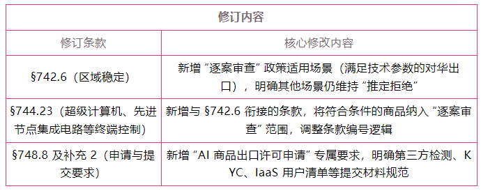 原政策:对中国、中国澳门出口特定先进半导体,许可证审查默认 “推定拒绝”(Presumption of Denial),几乎无法获批;